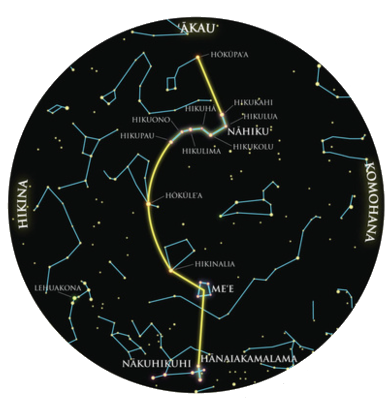 With a vast number of stars and complex information to memorize, the wayfinder simplifies this daunting task by mentally dividing the celestial sphere into four nearly equal parts. The brightest stars within each quarter are then grouped into large constellations that stretch across the sky from north to south. These four groupings collectively form Nā ʻOhana Hōkū 'Ehā, The Four Star Families.